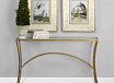 Изящно изогнутое железо ручной ковки, отделанное сильно состаренным золотым листом. Верх - прозрачное закаленное стекло со скошенной кромкой.